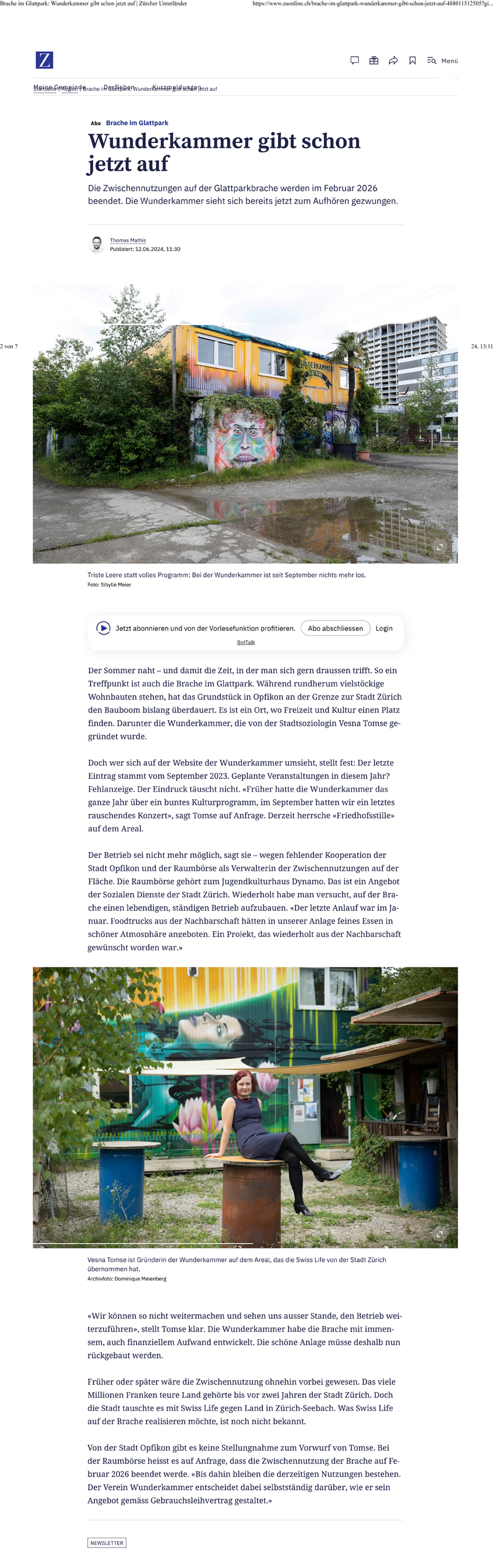 Der Züri Unterländer, der die Wunderkammer Glattpark seit ihren Anfängen begleitet, reagierte als einzige Zeitung auf den fehlenden Betrieb der Wunderkammer. Und fragte bei Raumbörse und Opfikon nach, warum denn die nötigen Bewilligungen nicht gegeben würden. Die Antwort steht noch immer aus.